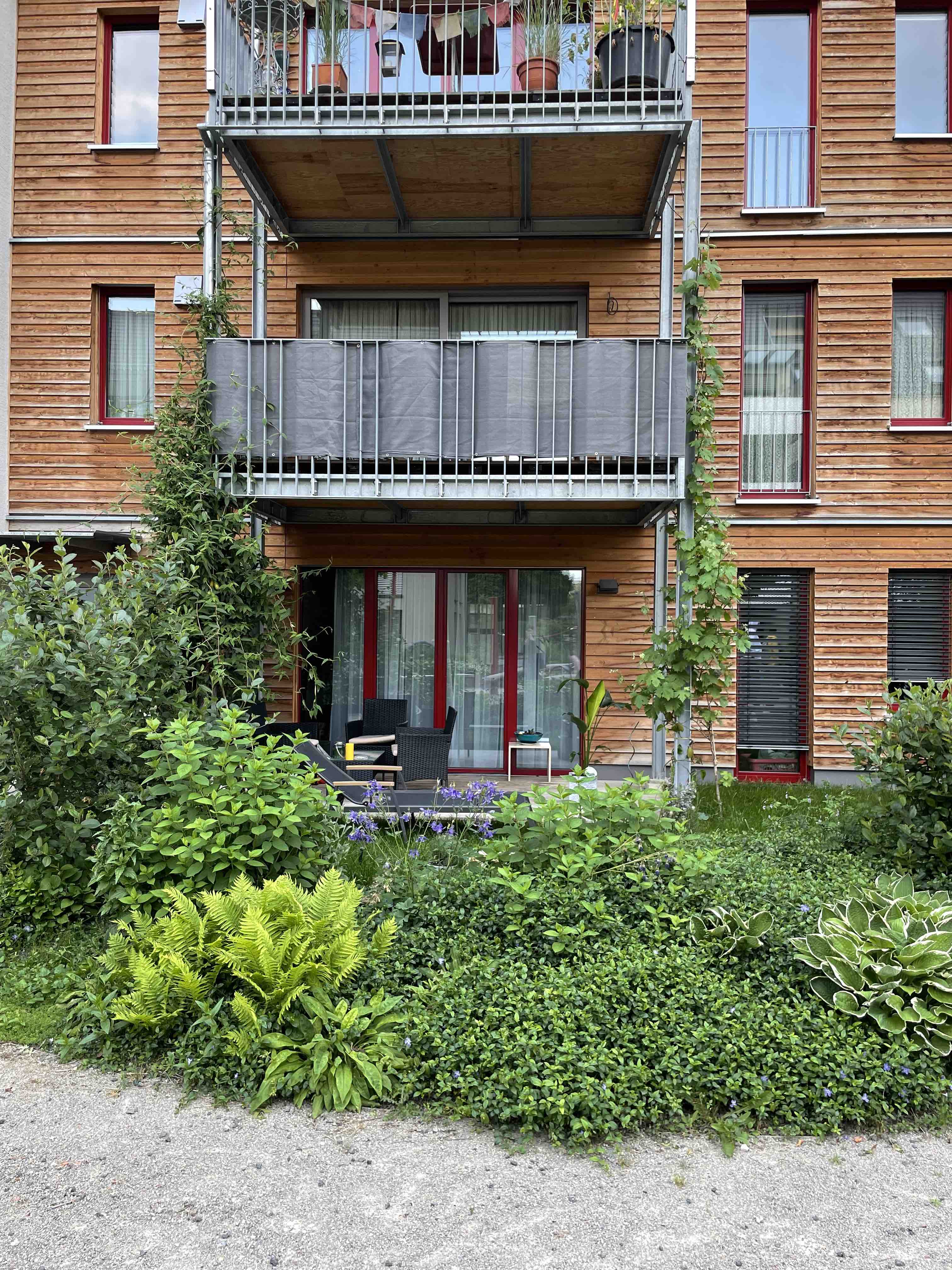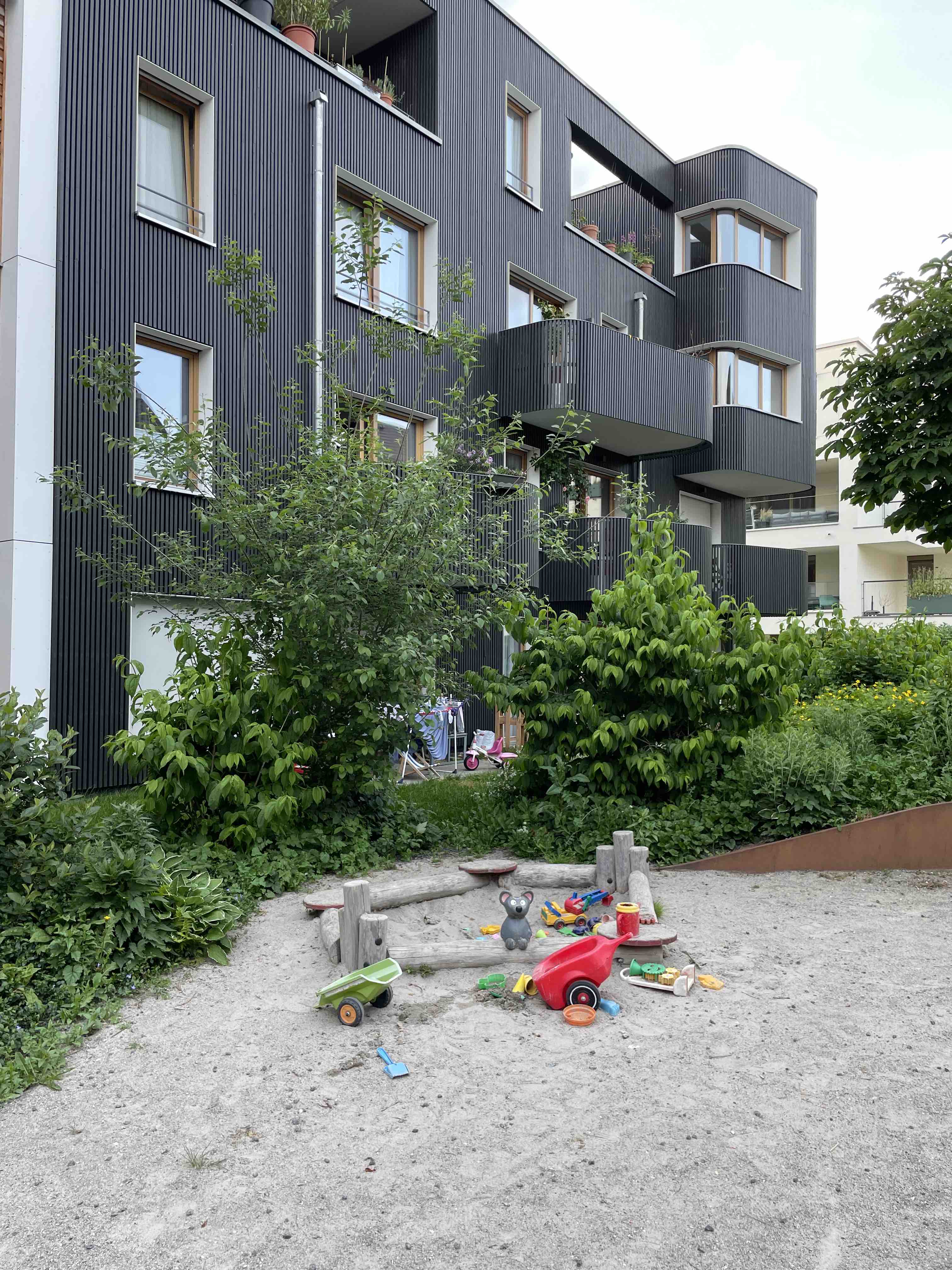 Wir beginnen unsere Erkundung durch das Quartier. Die Straßen sind noch nicht fertiggestellt, aber an vielen Ecken ist bereits ein Quartiersleben erkennbar. Wir bemerken, dass der öffentliche Raum eine sgroße Bedeutung für das Quartier hat. Er ermöglicht spontane Begegnungen und durch die aktiven Erdgeschosszonen entsteht eine Schnittstelle zwischen Haus und Quartier. Die Innenhöfe werden von den Bewohner:innen gemeinschaftlich bewirtschaftet und genutzt. Aber angrenzend an die gemeinschaftlichen Höfe gibt es auch private Grünflächen. Zäune entdecken wir nur wenige. Die Gestaltung lässt damit eine Durchlässigkeit zwischen privatem und öffentlichem Raum zu. Auch in dem Einfamilienhausgebiet, in dem die Bewohner:innen leben, gab es beim Erstbezug der Häuser in den 1970er Jahren ein Zaunverbot. Die Hecken waren niedrig und Begegnungen zwischen Nachbar:innen waren möglich. Heute sind die Hecken hoch und dicht gewachsen und schirmen die privaten Bereiche vom öffentlichen Raum ab. Ein Bewohner sagt: “Ich mag meinen Wald.”
