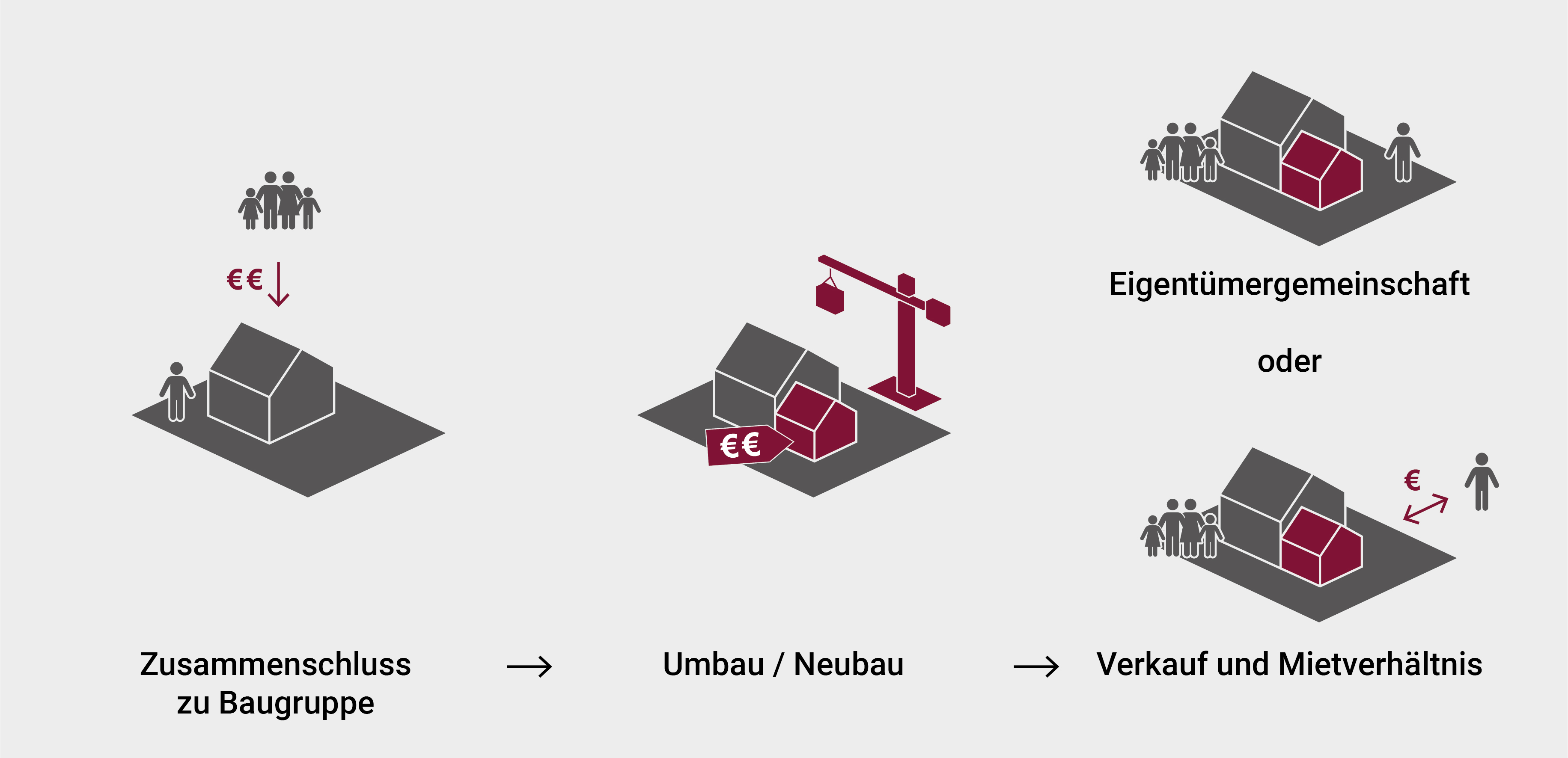 In vielen Quartieren verhindern die Eigentumsverhältnisse und Aufteilung der Grundstücke eine Nutzung von Potenzialen durch Einzeleigentümer, sodass sich mehrere von ihnen zusammenschließen müssen. Dabei sind zwei Varianten denkbar: Eine Möglichkeit ist ein temporärer Zusammenschluss als Baugruppe, damit Baumaßnahmen gemeinsam durchgeführt und Wohnungen und Grundstücke nach Abschluss wieder in Einzeleigentum aufgeteilt werden können. Alternativ kann eine dauerhafte Vereinigung beispielsweise zu einer lokalen Genossenschaft stattfinden. Solche Quartiers-Genossenschaften können als