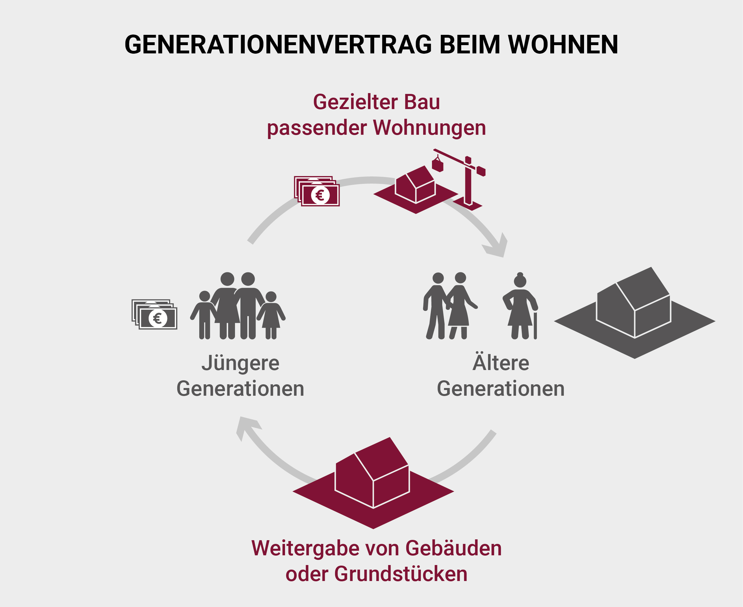 Der Begriff ‚Generationenvertrag‘ ist dabei bekannt aus der gesetzlichen Rentenversicherung. Es handelt sich um einen bildlich zu verstehenden, solidarischen Vertrag zwischen Generationen, der eine Umlagefinanzierung der Renten vorsieht. Überträgt man das Prinzip auf das Wohnen, kann stattdessen ein gegenseitiges Umlageverfahren aus unterschiedlichen Ressourcen gebildet werden. Dabei kann es keine pauschale Lösung geben.