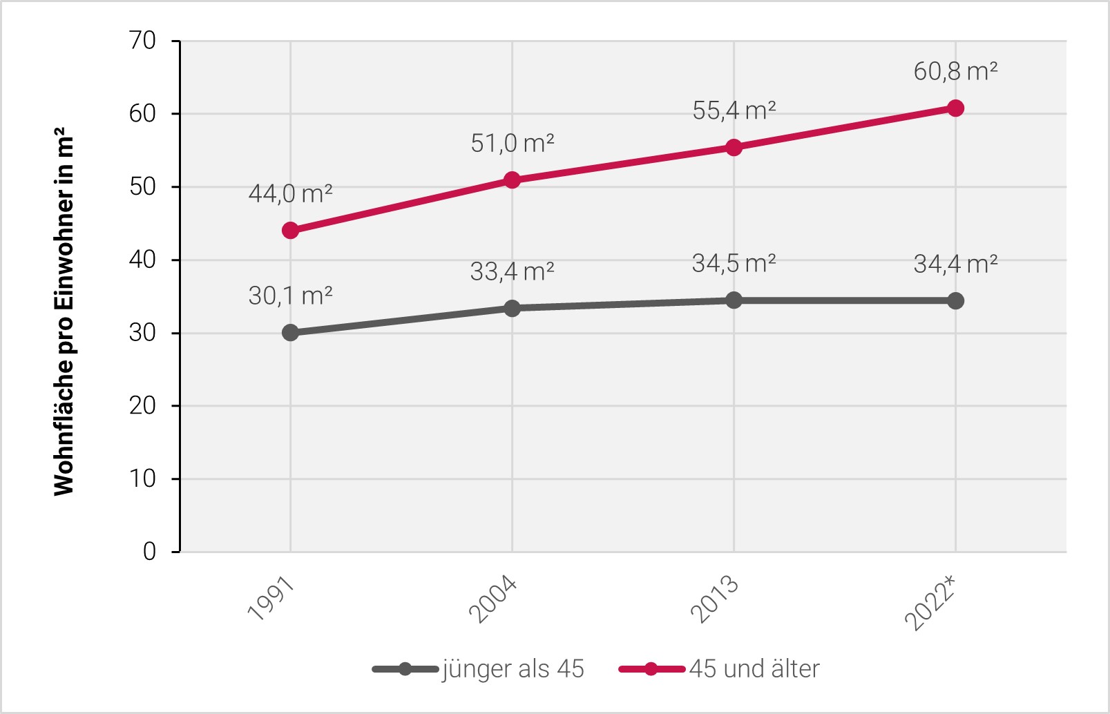Eigene Darstellung basierend auf 1991-2013: SOEP/Institut der deutschen Wirtschaft Köln veröffentlicht in Deschermeier, Philipp/Henger, Ralph (2015): Die Bedeutung des zukünftigen Kohorteneffekts auf den Wohnflächenkonsum. In: IWTrends - Vierteljahresschrift zur empirischen Wirtschaftsforschung, Nr. 42, S. 23-39. [online] https://doi.org/10.2373/1864-810X.15-03-02 [Zugriff: 08.06.2022], S. 26; Statistisches Bundesamt (Destatis, Hrsg.) (14.06.2023): Pressemitteilung Nr. N 035 vom 14. Juni 2023. [online] https://www.destatis.de/DE/Presse/Pressemitteilungen/2023/06/PD23N03512.html [Zugriff: 02.01.2025].