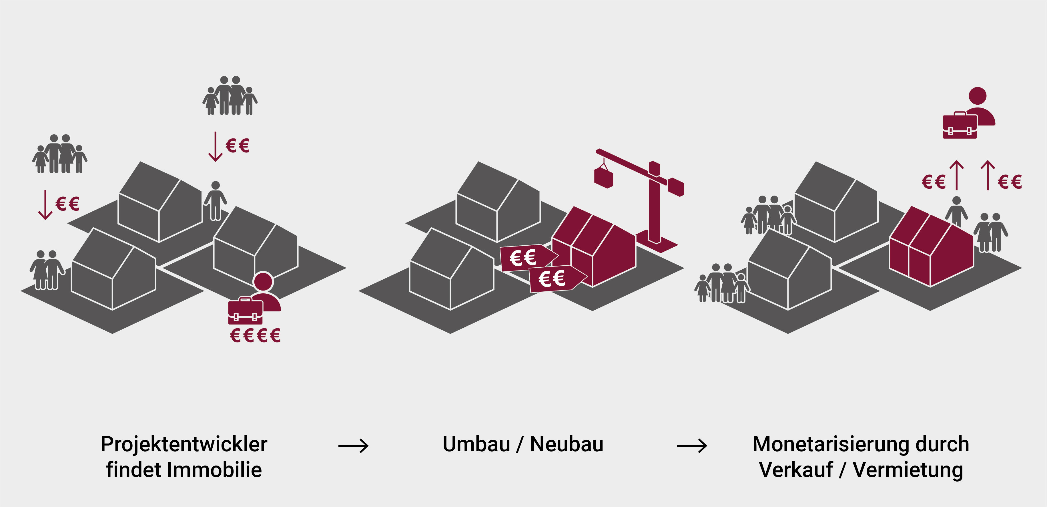 Wohneigentum dient vielen auch als Altersvorsorge. Im Alter möchte man als Wohneigentümer daher vielleicht keine großen finanziellen Risiken durch bauliche Veränderungen mehr eingehen. Schlüsselfertige Angebote von externen Investoren mit geringem finanziellem Risiko sind daher womöglich eine Alternative. Insbesondere Baulücken oder Grundstücke mit Gebäuden, die sich für einen Umbau anbieten, können von der privaten Wohnungswirtschaft oder einer Stadtentwicklungsgesellschaft gezielt entwickelt werden. Dabei sollten die Anwohner des Quartiers früh in die Planung miteinbezogen werden, um diese als Zielgruppe anzusprechen. Auch so kann ein Wohnungsangebot entstehen, durch das größere Wohnungen frei werden und eine Nutzungsverdichtung im Bestand stattfindet.