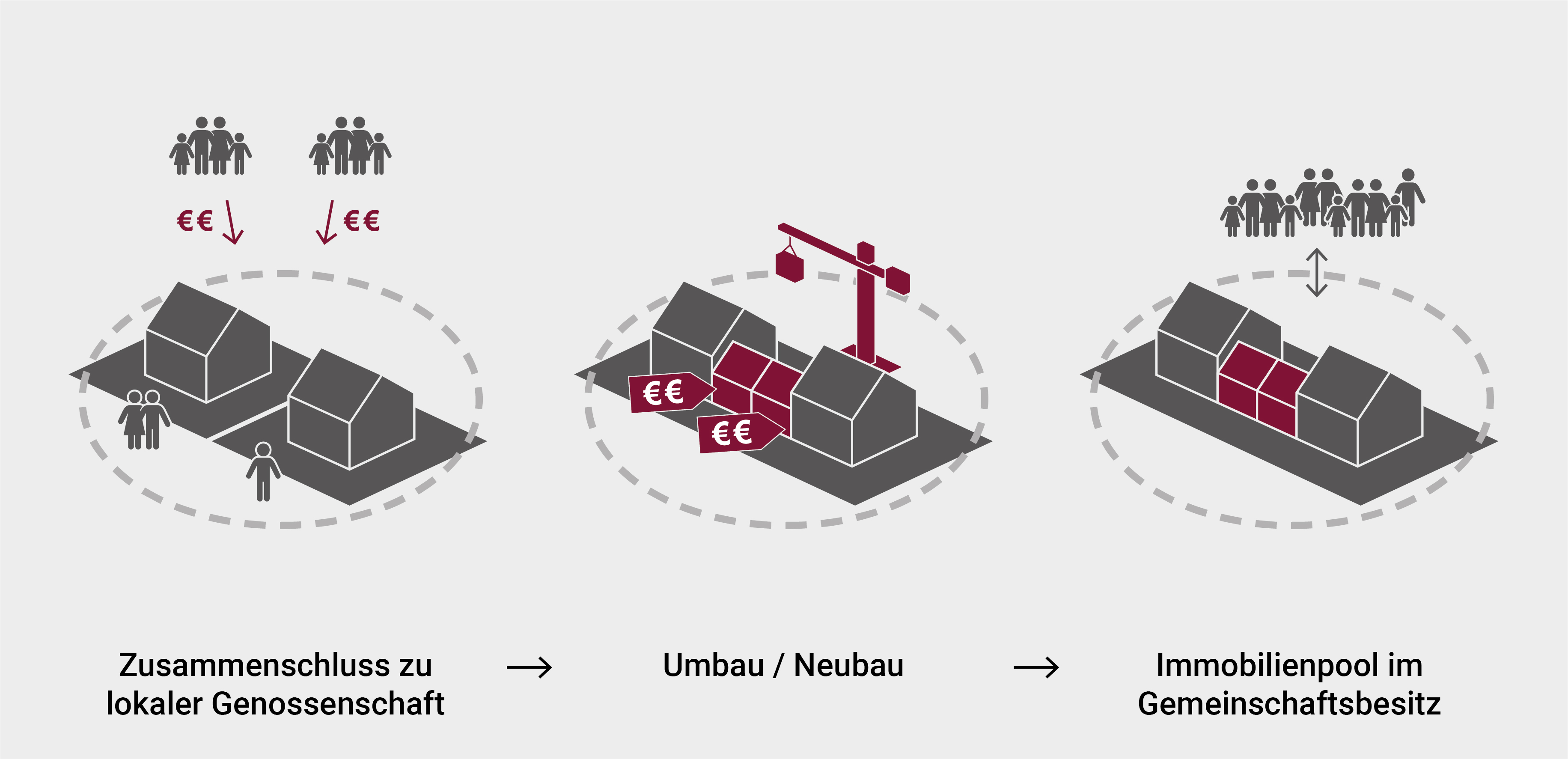 In vielen Quartieren verhindern die Eigentumsverhältnisse und Aufteilung der Grundstücke eine Nutzung von Potenzialen durch Einzeleigentümer, sodass sich mehrere von ihnen zusammenschließen müssen. Dabei sind zwei Varianten denkbar: Eine Möglichkeit ist ein temporärer Zusammenschluss als Baugruppe, damit Baumaßnahmen gemeinsam durchgeführt und Wohnungen und Grundstücke nach Abschluss wieder in Einzeleigentum aufgeteilt werden können. Alternativ kann eine dauerhafte Vereinigung beispielsweise zu einer lokalen Genossenschaft stattfinden. Solche Quartiers-Genossenschaften können als
